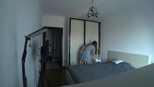 카메라에 그녀의 작은 젖탱이와 팽팽한 엉덩이를 보여주는 십대 귀염둥이